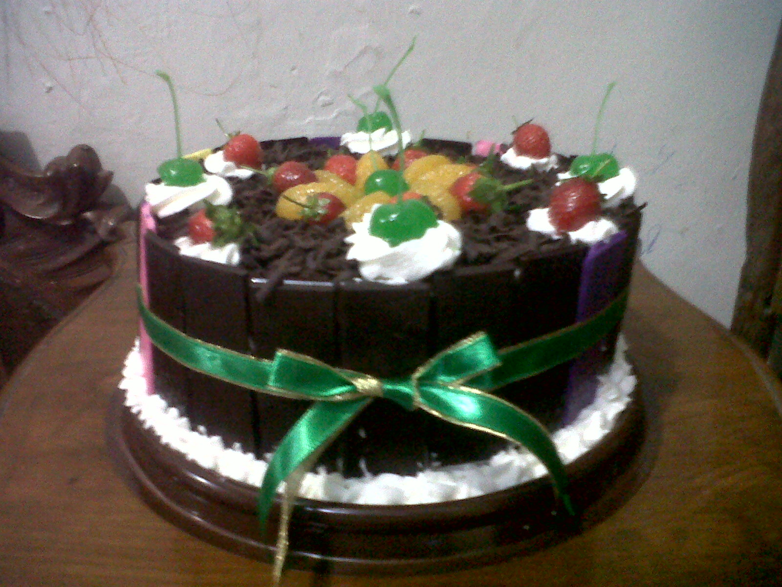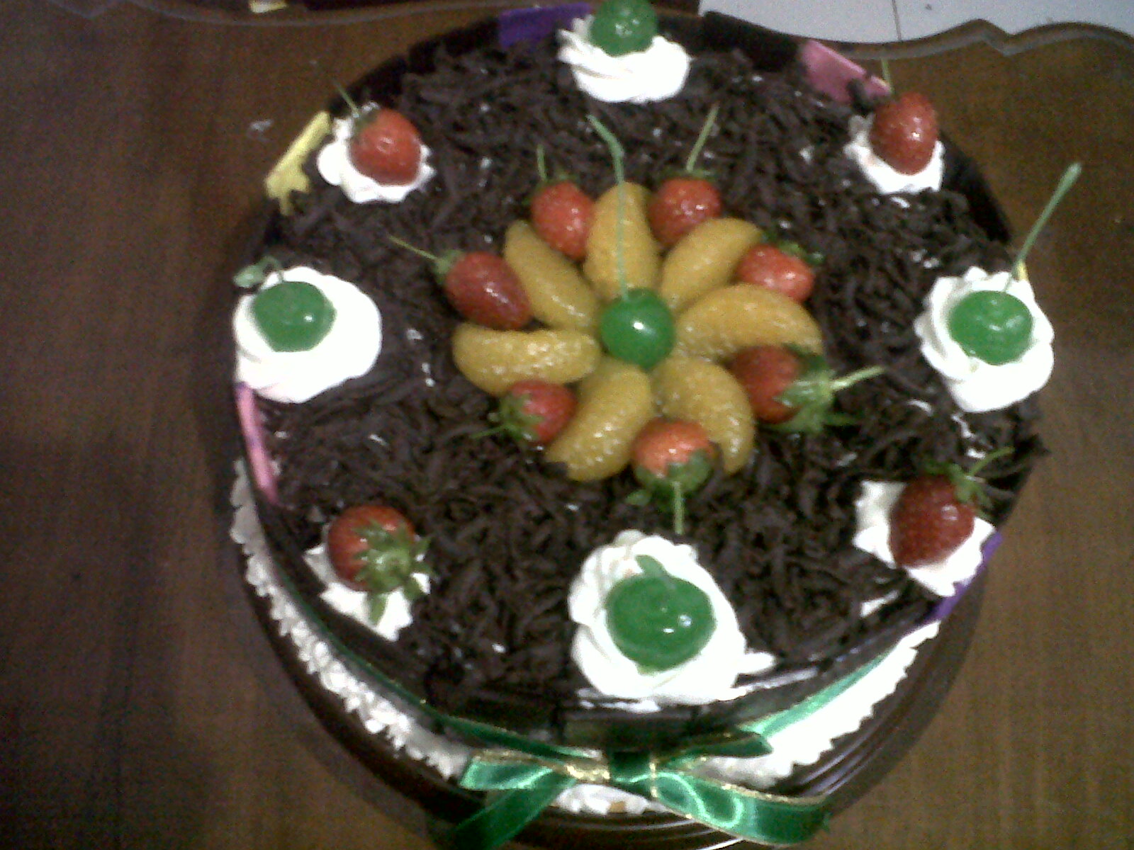 Birthday cake untuk ulang tahun ayah Sasi, bunda bikin black forest special, filing whipcream dark chery, decornya pager coklat warna warni, toping coklat serut, strawbery & chery.