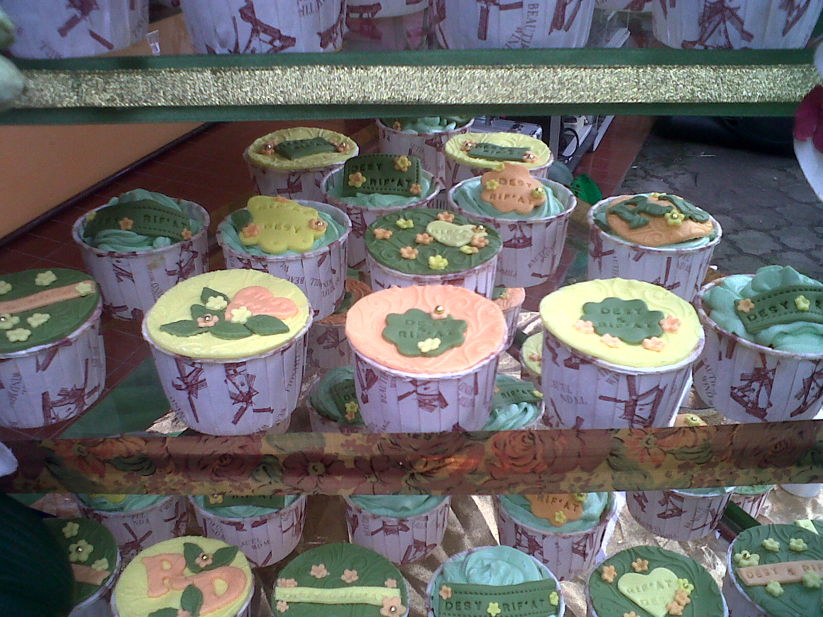 Pesennya 60 cupcake ukuran standar, 1 top cake, isi & dekornya terserah aku, manut aku, yang penting nuansa ijo & emas.